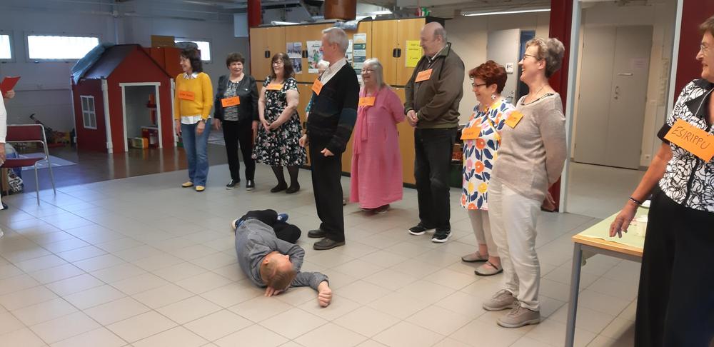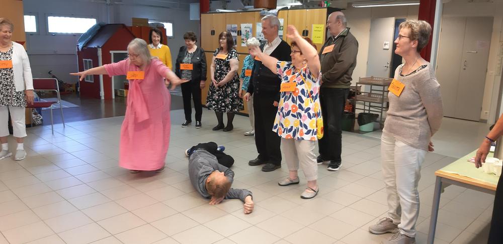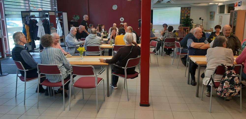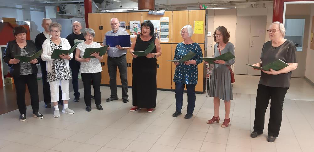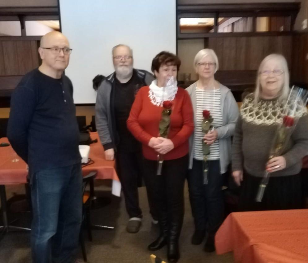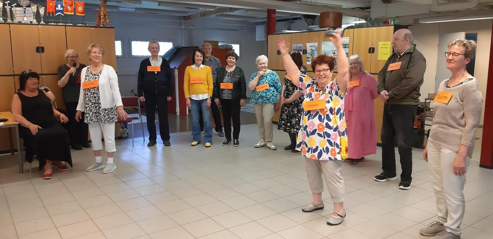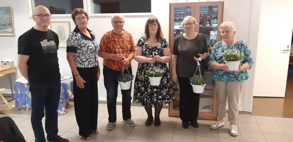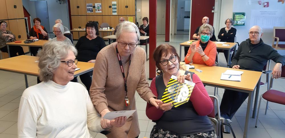Kahvila-olohuoneessa musavisakilpailun voittajat! Keskellä visailun vetäjä Leila Peuna.