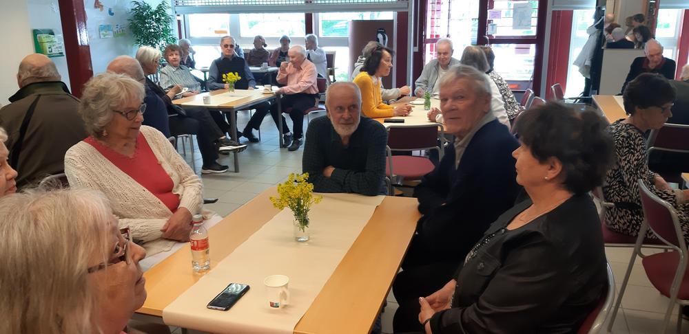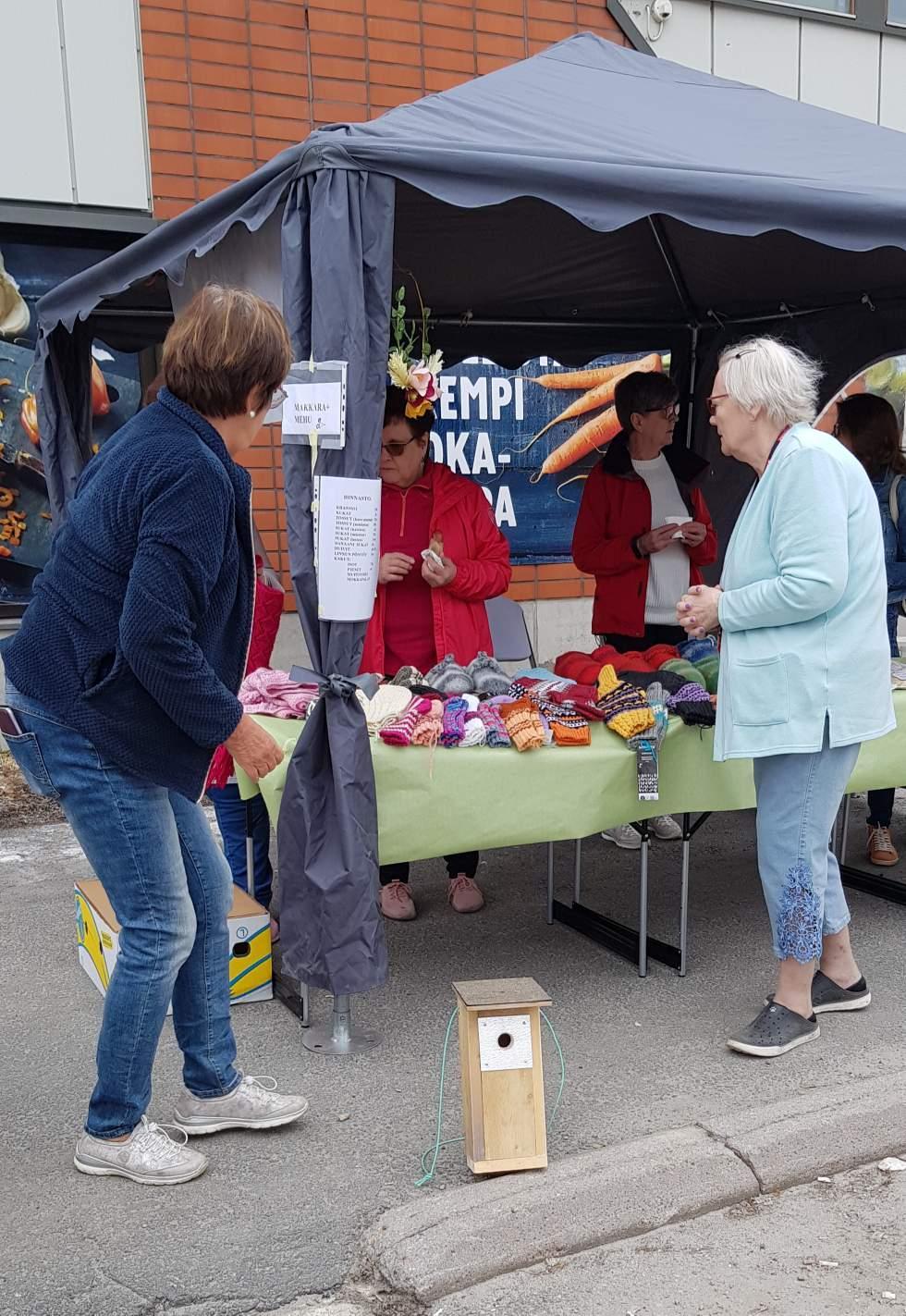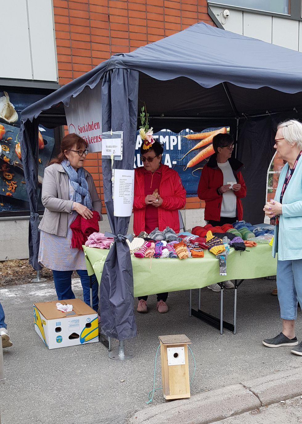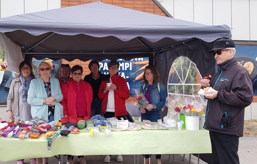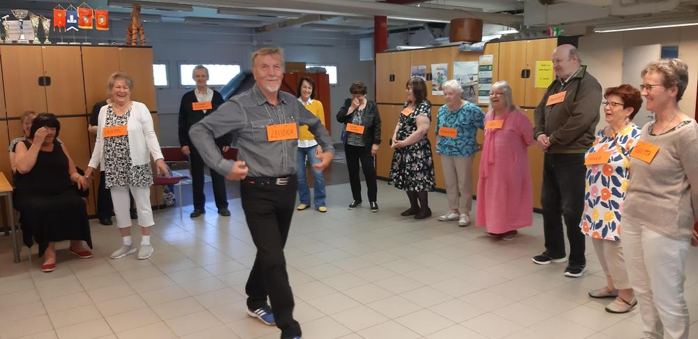 Kahvila-olohuoneessa musavisakilpailun voittajat! Keskellä visailun vetäjä Leila Peuna.